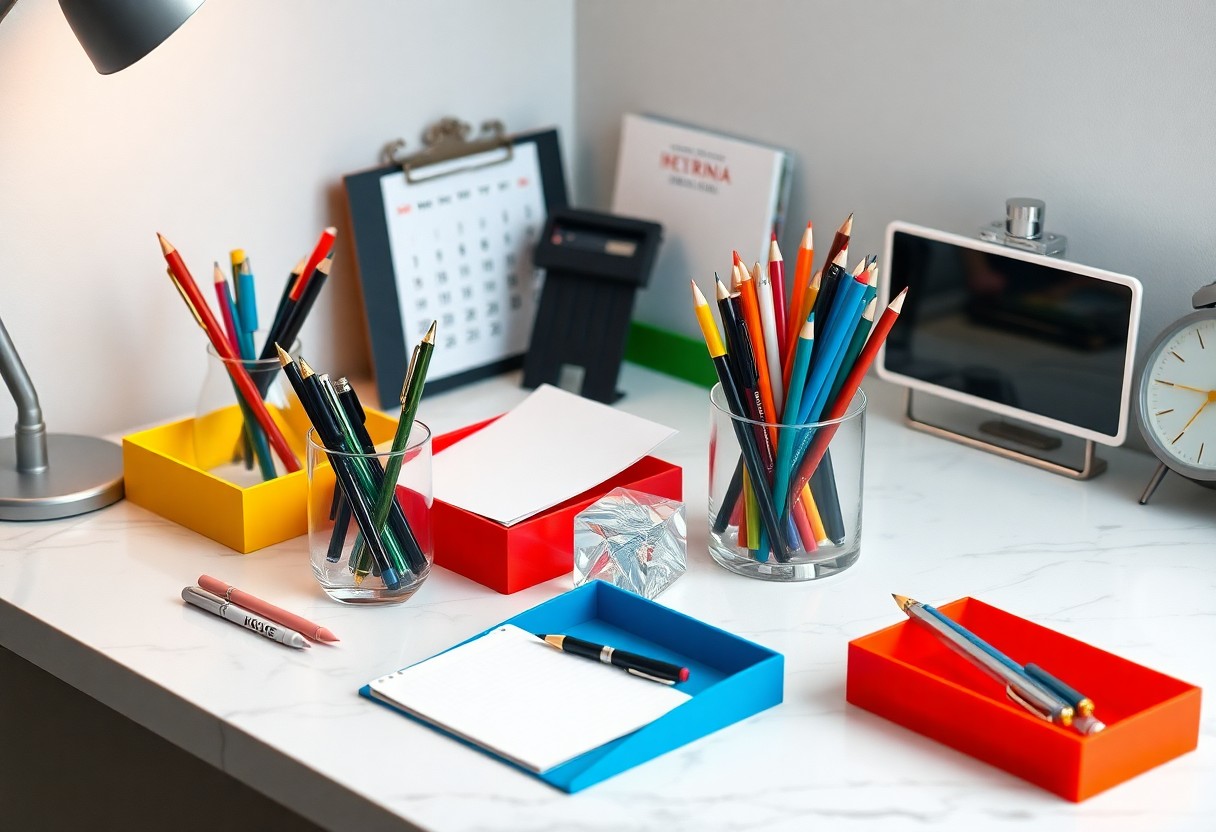 Eine gut durchdachte Organisation von Schreibwaren kann Ihren Schreibtisch nicht nur aufgeräumter, sondern auch funktioneller machen. Nutzen Sie bunte Aufbewahrungslösungen wie Schubladeneinsätze oder Stiftbecher, um Ihre Utensilien übersichtlich zu halten. Magnetische Lösungen sind ebenfalls beliebt, um häufig genutzte Artikel wie Notizblöcke und Scheren schnell griffbereit zu haben. Achten Sie darauf, Ihre Lieblingsfarben und Materialien zu wählen, um eine angenehme Arbeitsatmosphäre zu schaffen.