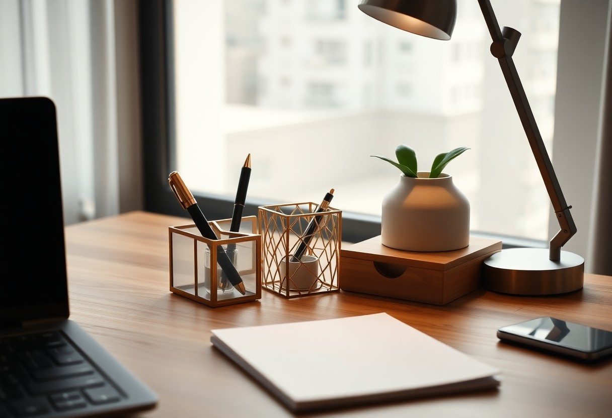 Q: Welche dekorativen Elemente eignen sich für einen aufgeräumten Schreibtisch?
